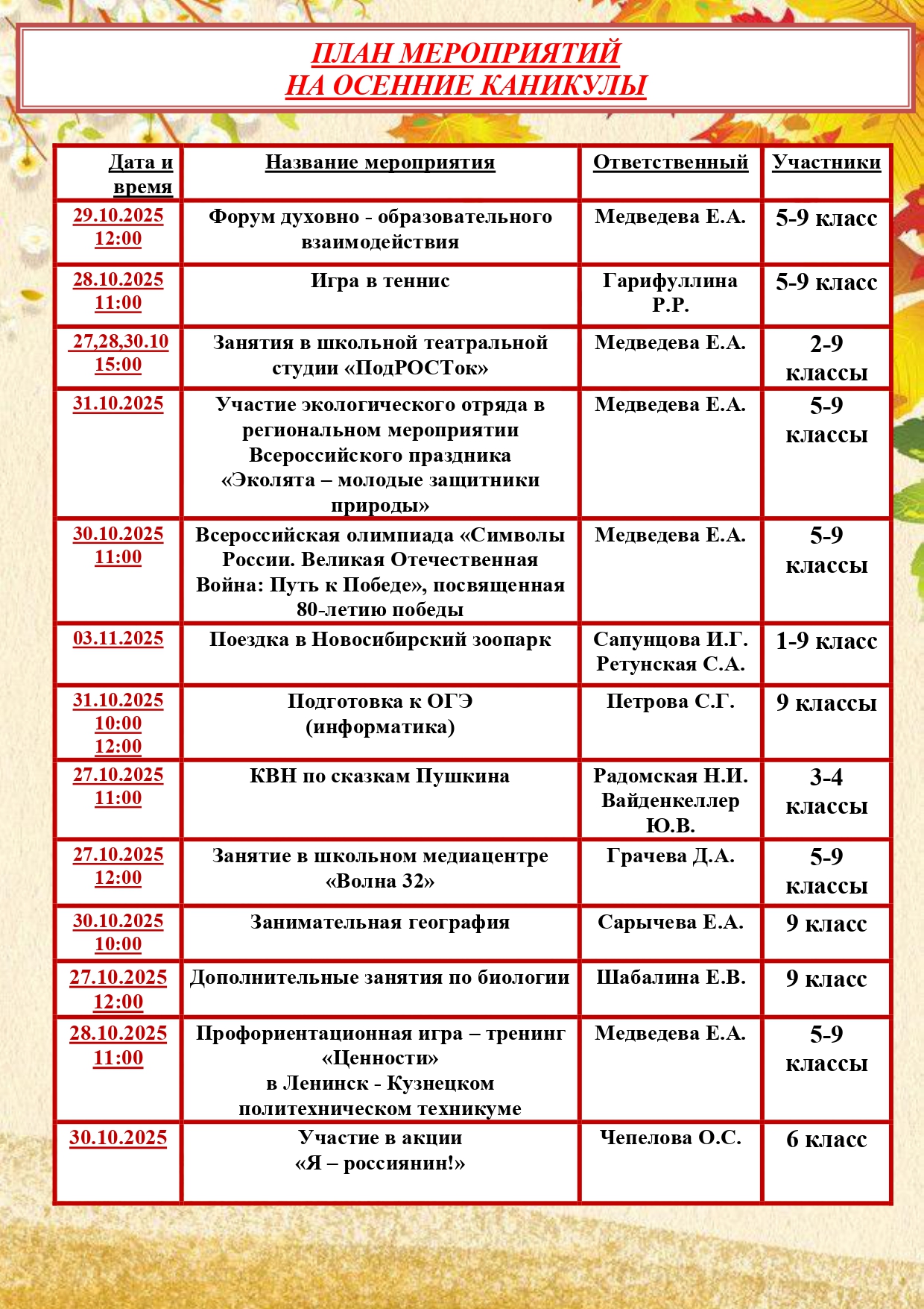 План работы на каникулы